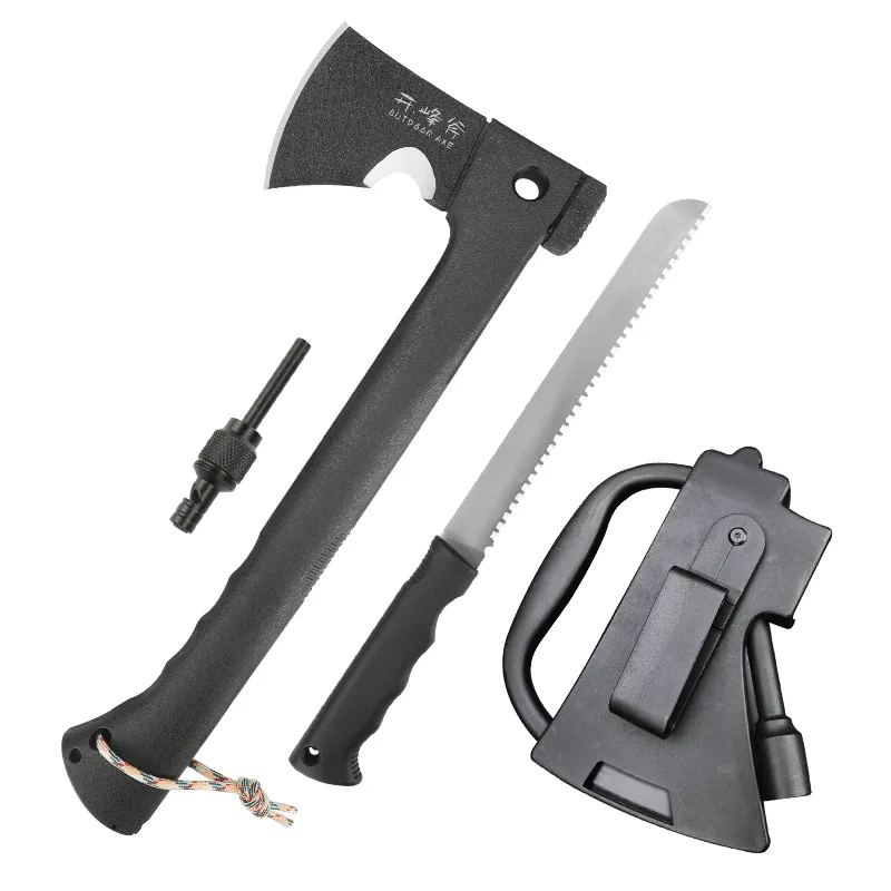 终极求生工具!这款六合一露营斧集斧头、锯子、锤子、绳索切割器、紧急哨和打火棒于一体——是丛林生存、徒步旅行和野外生存的完美之选。